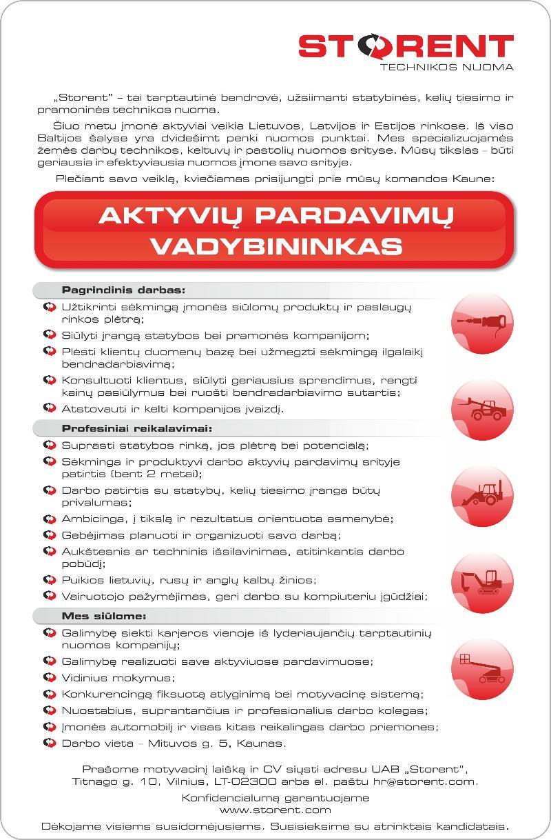 Prašome motyvacinį laišką ir CV iki rugpjūčio 12 siųsti adresu UAB „Storent“, Titnago g. 10, Vilnius, LT-02300 arba el. paštu simas.rimkus(at)storent.com.