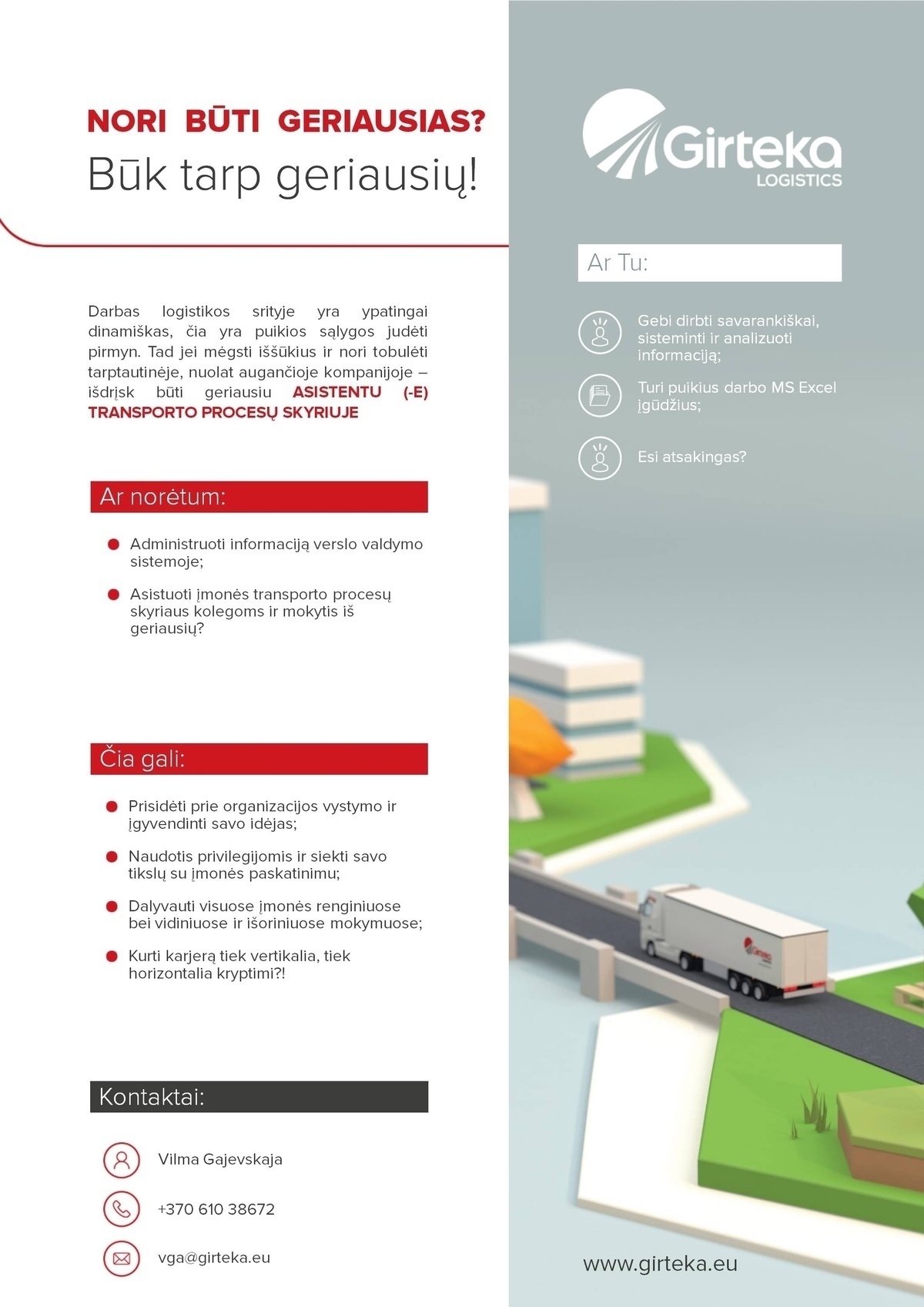 Girteka logistics, UAB ASISTENTAS (-Ė) TRANSPORTO PROCESŲ SKYRIUJE