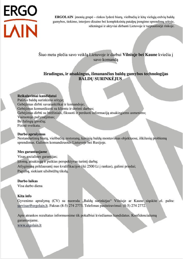 Gyvenimo aprašymą (CV) su nuoroda „Baldų surinkėjas“ Vilniuje ar Kaune siųskite el. paštu: vilma(eta)ergolain.lt. Faksas (8-5) 274 2773. Telefonas pasiteiravimui: (8-5) 274 2772.
