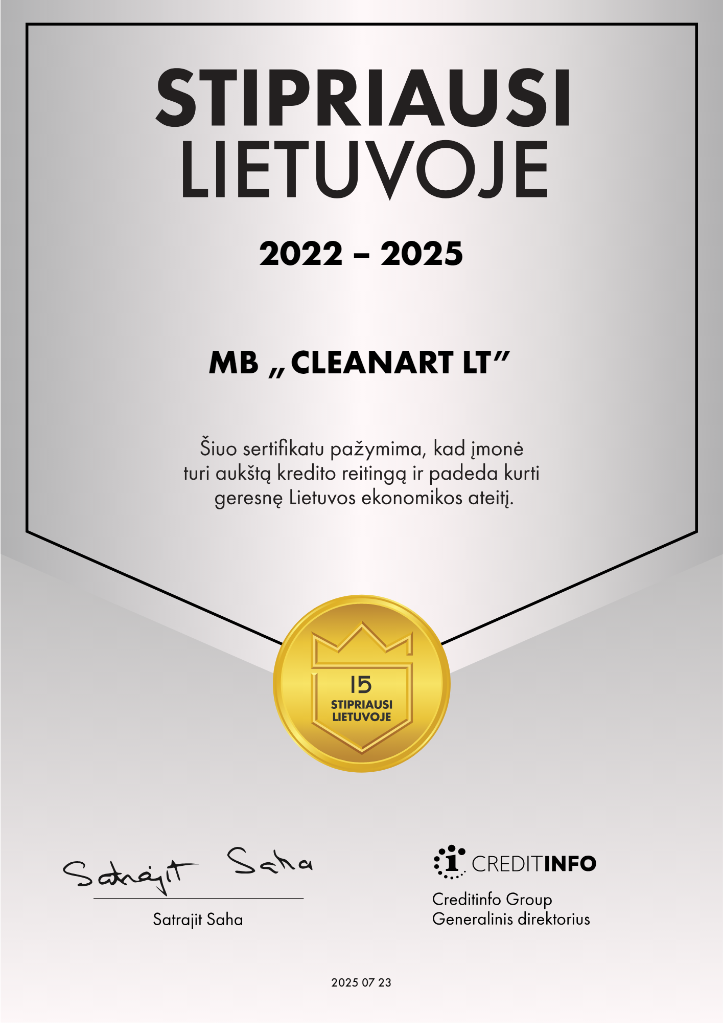 MB „CleanArt LT“ – auganti ir patikima valymo paslaugų įmonė, teikianti profesionalias namų ir komercinių patalpų valymo paslaugas. Specializuojamės periodiniame, generaliniame, postatybiniame bei langų valyme. Vertiname kokybę, atsakomybę ir savo darbuotojus – suteikiame visas reikalingas darbo priemones, palaikymą bei galimybes augti kartu su įmone.