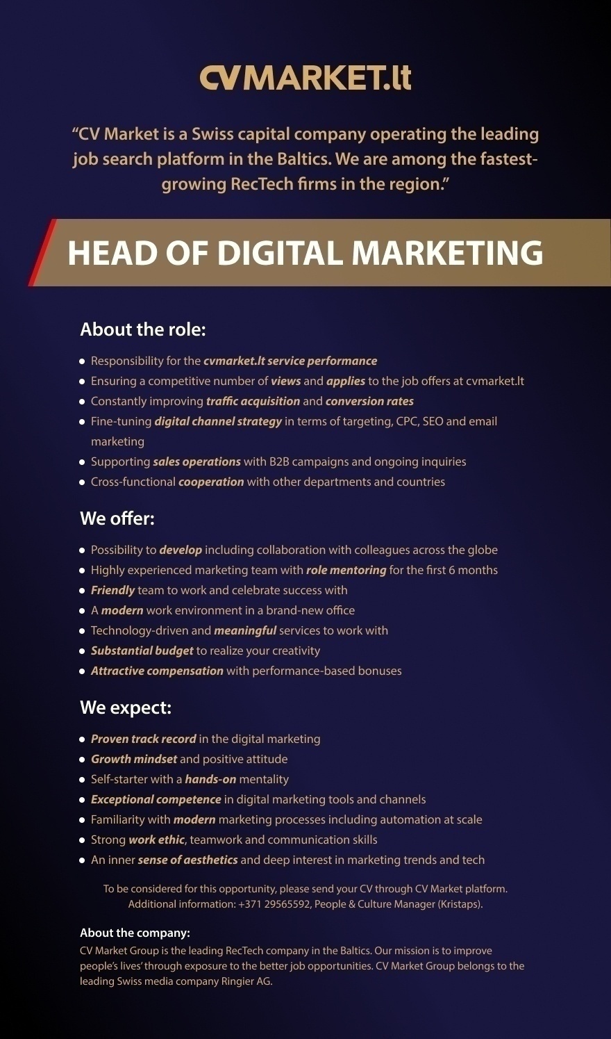 To be considered for this opportunity, please send your CV through CV Market platform.Additional information: +371 29565592, People & Culture Manager (Kristaps).