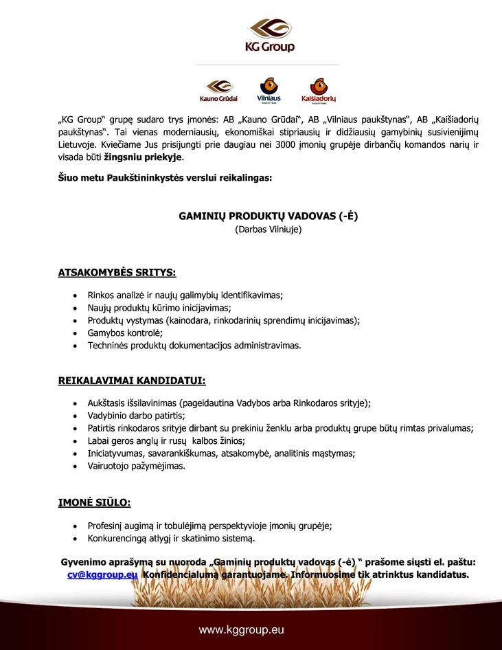 GAMINIŲ PRODUKTŲ VADOVAS (-Ė) (Darbas Vilniuje)