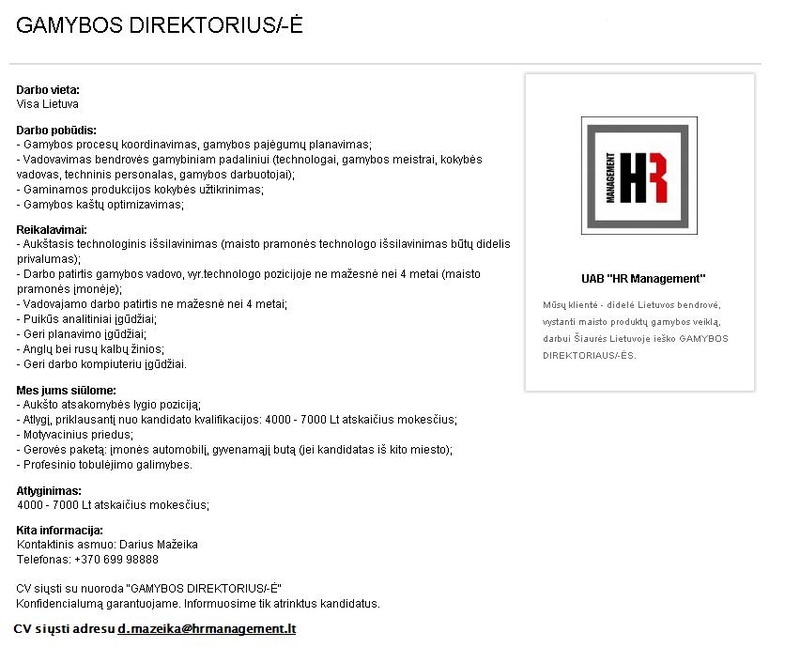 HR MANAGEMENT, UAB GAMYBOS DIREKTORIUS/-Ė