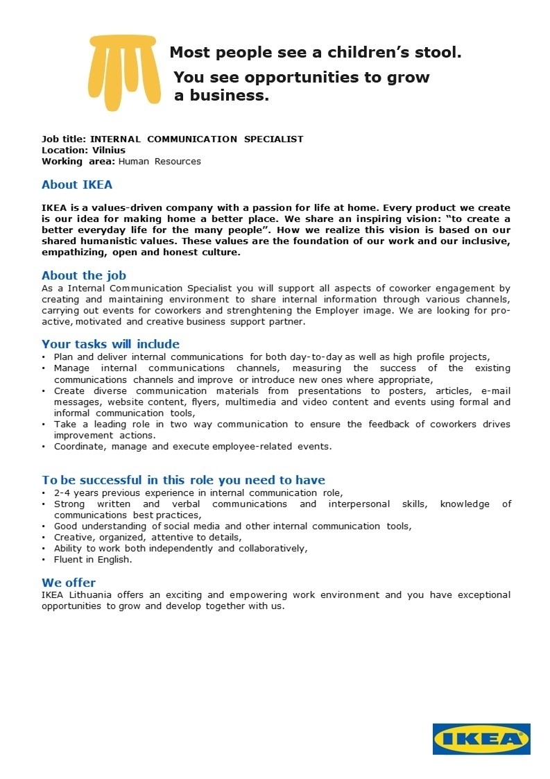 As a Internal Communication Specialist you will support all aspects of coworker engagement by creating and maintaining environment to share internal information through various channels, carrying out events for coworkers and strenghtening the Employer image. We are looking for pro-active, motivated and creative business support partner.