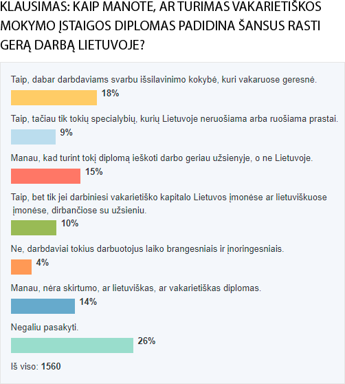 Patys dirbantieji Lietuvoje apie „importinį“ išsilavinimą yra pačių įvairiausių nuomonių. 14 proc. ir lietuviškas ir vakarietiškas aukštojo mokslo diplomas atrodo vienodai patrauklus. 19 proc. teigia, kad vakarietiškas išsilavinimas tikrai atveria daugiau durų, nes darbdavius žavi tokio mokymo ir įgytų žinių kokybė, tačiau 9 proc. respondentų linkę manyti, kad darbdavius Lietuvoje įmanoma sugundyti tik tokia užsienyje įgyta specialybe, kurios specialistai Lietuvoje ruošiami prastai ar išvis neruošiami.