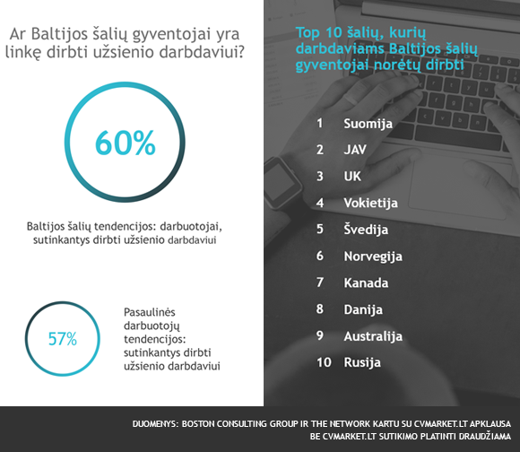 Taip pat apklausoje teiravomės, ar žmonės būtų linkę dirbti nuotoliniu būdu užsienio darbdaviui. Net 60% apklaustųjų iš Baltijos šalių būtų linkę dirbti užsienio darbdaviui. Pageidautina, įmonė būtų iš Skandinavijos, JAV, UK ar Vokietijos.