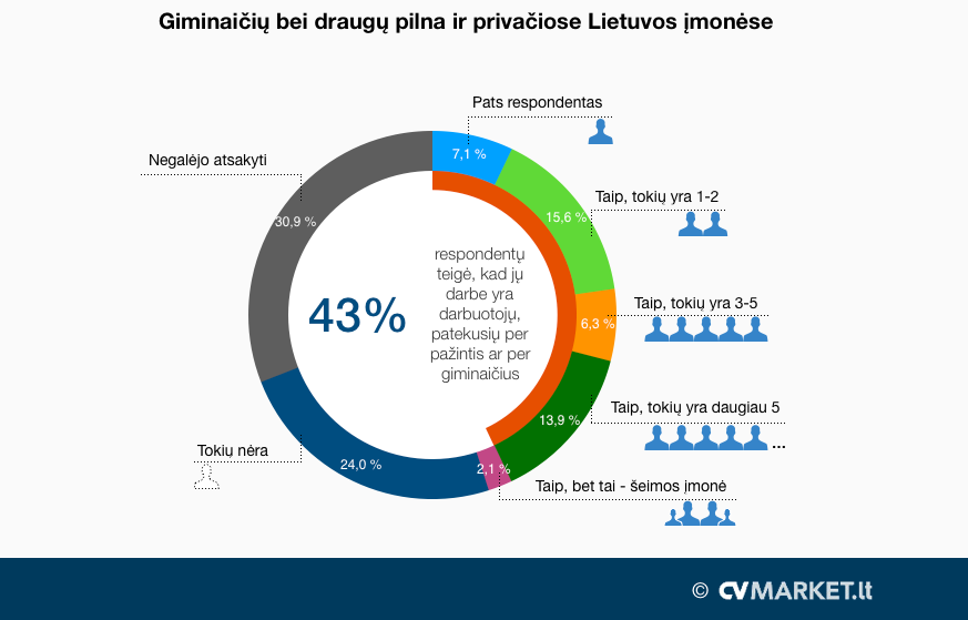 Kad jų darbovietėje yra žmonių, patekusių į ją kraujo ar kitokių ryšių dėka, nurodė net 43 proc. apklaustųjų. 15,7 proc. visų respondentų mano, kad tokių pas juos įmonėje yra vienas-du, 6,3 proc. suskaičiavo trys-penki, o 14 proc. net daugiau kaip penki. Dar 7,2 proc. prisipažino, kad per pažintis ar giminystę gavo darbą patys.