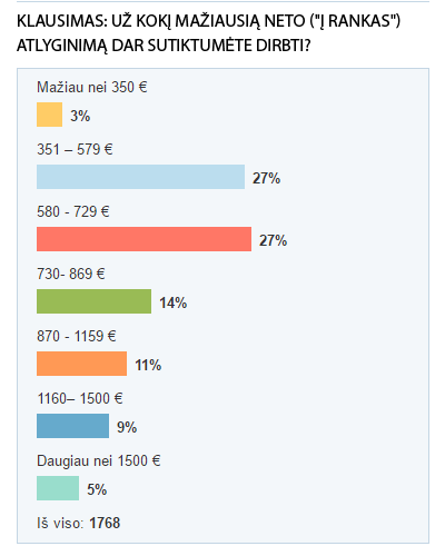 Prasidėjus 2017-iesiems, patenkintų minimaliu atlygiu, siekiančiu daugiausiai 579 eurus, beliko tik 30 proc., o už mažiau nei 350 eurų sutiko dirbti tik 3,5 proc. apklaustųjų.Greičiausiai tam didžiausios įtakos turėjo pernai metais šuoliavusios prekių ir paslaugų kainos bei ekonomistų prognozės, kad šiais metais viskas dar stipriau brangs.Tad asmenų, kuriems pageidaujama mažiausia alga prasideda nuo 580 eurų ar yra didesnė, dabar turime 69,5 proc. Iš jų beveik 28 proc. nurodė, kad dar sutiktų dirbti už 580-729 eurus, 14,9 proc. įvardijo kaip tinkamą mažiausią 730-869 eurų, 11,7 proc. - 870-1159 eurų darbo atlygį. Tų, kam minimali alga prasideda bent jau nuo 1160 eurų per mėnesį „į rankas“ šiemet prisirinko 9,5 proc., o nuo 1500 eurų – 5,5 proc. 2007 m. minimalios algos brūkšnį ties 1160 eurų ar didesne suma brėžė tik 7,6 proc. apklaustųjų.