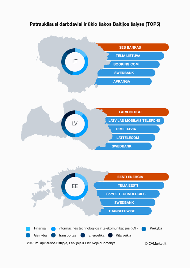 Pasauliniuose geriausių darbdavių topuose pačiais pačiais tradiciškai renkami informacinių ir komunikacijos technologijų bei finansų sektorių atstovai. Lietuviai, latviai ir estai pasaulinių „madų“ taipogi laikosi lyg susitarę. CVMarket.lt kasmet renkamuose patraukliausių darbdavių dvidešimtukuose didžiąją dalį sudaro įmonės, veikiančios telekomunikacijų bei IT ir finansų srityse. Visų trijų valstybių TOP’uose taip pat yra gamybos, prekybos bei transporto įmonių.
