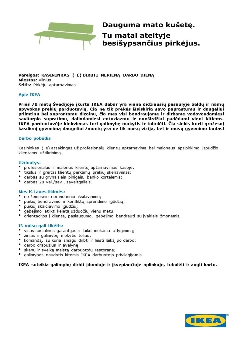 IKEA Lietuva (Felit) Kasininkas (-ė) dirbti savaitgaliais