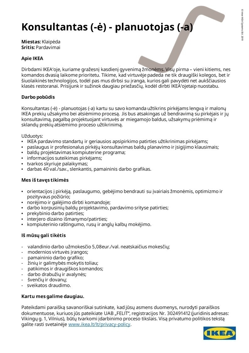 Konsultantas (-ė) - planuotojas (-a) kartu su savo komanda užtikrins pirkėjams lengvą ir malonų IKEA prekių užsakymo bei atsiėmimo procesą. Jis bus atsakingas už bendravimą su pirkėjais ir jų konsultavimą, pagalbą projektuojant virtuvės ar miegamojo baldus, užsakymų priėmimą ir sklandų prekių atsiėmimo proceso užtikrinimą.