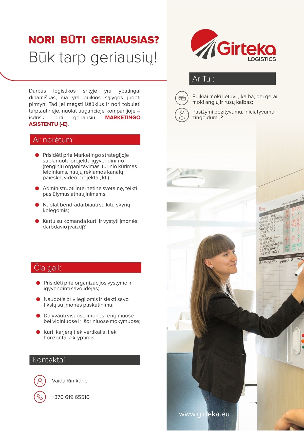 Prisidėti prie Marketingo strategijoje suplanuotų projektų įgyvendinimo (renginių organizavimas, turinio kūrimas leidiniams, naujų reklamos kanalų paieška, video projektai, kt.);