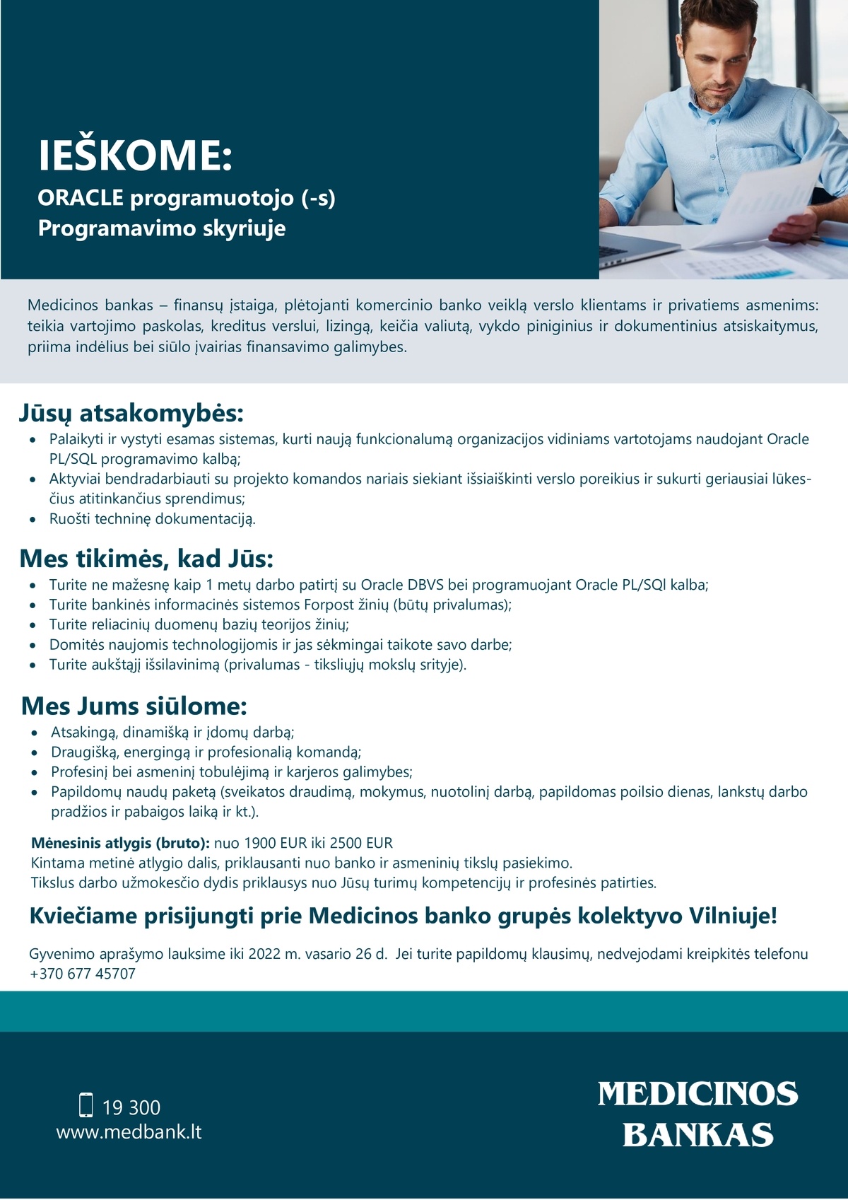 Turite ne mažesnę kaip 1 metų darbo patirtį su Oracle DBVS bei programuojant Oracle PL/SQl kalba;