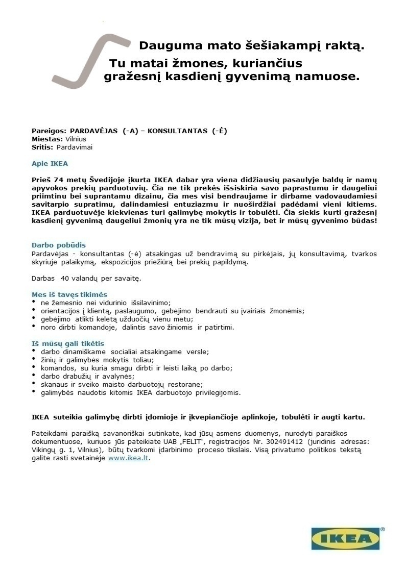 Pardavėjas - konsultantas (-ė) atsakingas už bendravimą su pirkėjais, jų konsultavimą, tvarkos skyriuje palaikymą, ekspozicijos priežiūrą bei prekių papildymą.