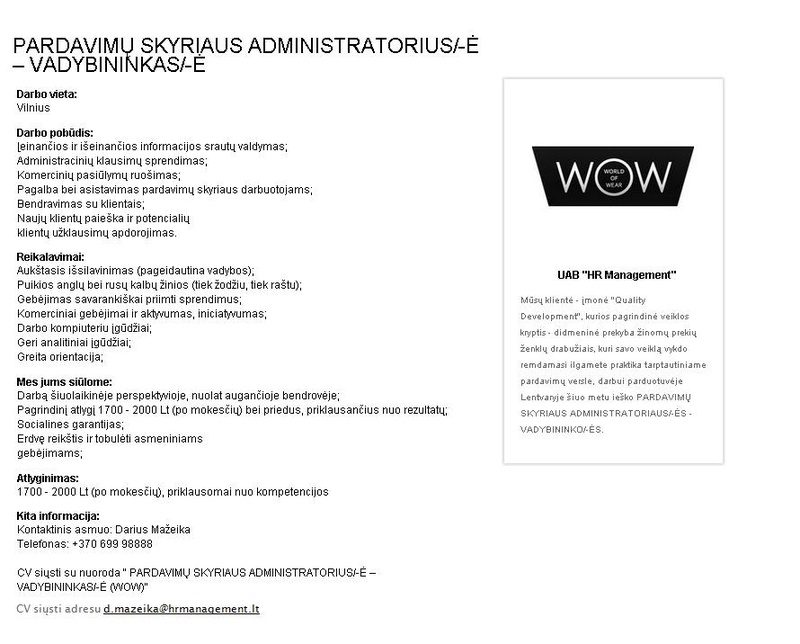 PARDAVIMŲ SKYRIAUS ADMINISTRATORIUS/-Ė – VADYBININKAS/-Ė