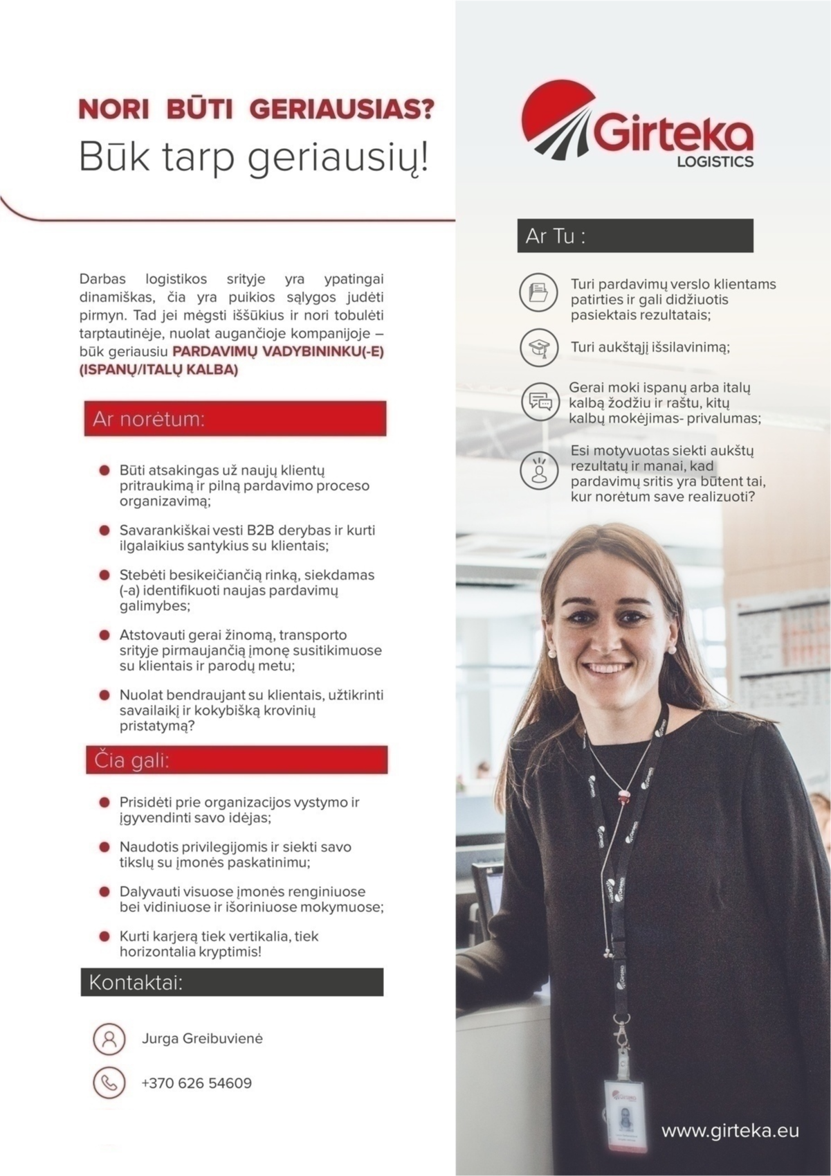 Girteka logistics, UAB PARDAVIMŲ VADYBININKAS (-Ė) (ISPANŲ IR/AR ITALŲ KALBA)