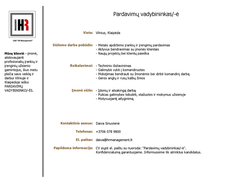 HR MANAGEMENT, UAB Pardavimų vadybininkas/-ė