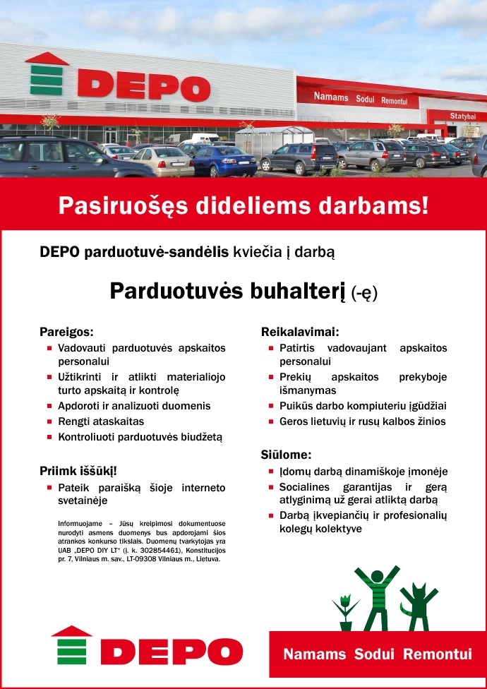 DEPO DIY LT, UAB Parduotuvės buhalterį (-ę) VILNIUJE