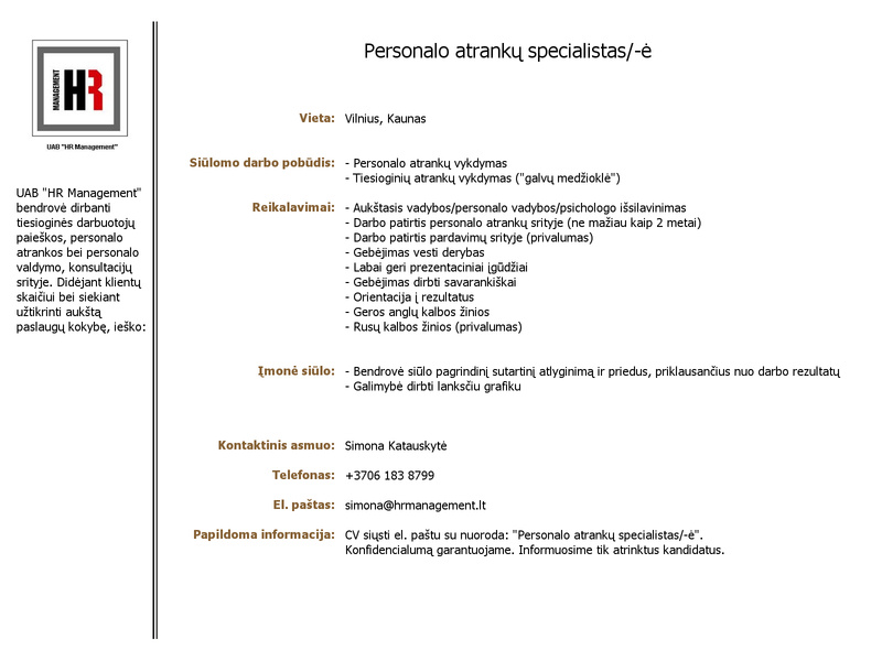 HR MANAGEMENT, UAB Personalo atrankų specialitas