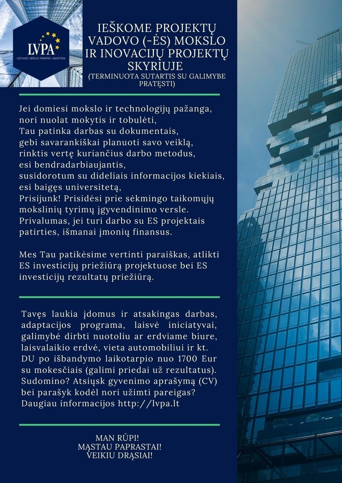 Dėkojame visiems atrankoje dalyvausiantiems kandidatams, o su labiausiai reikalavimus atitinkančiais kandidatais susisieksime per savaitę nuo CV gavimo dienos. Konfidencialumą garantuojame.