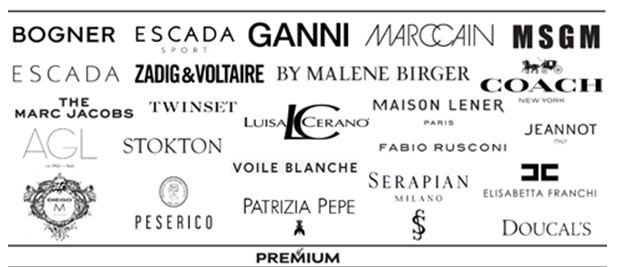 ESCADA, ESCADA SPORT, MARC JACOBS, MICHAEL KORS, RED VALENTINO, POLO RALPH LAUREN, LUISA CERANO, ZADIG&VOLTAIRE, BY MALENE BIRGER, GANNI, COACH, TWINSET, PATRIZIA PEPE, SERAPIAN, REBECCA MINKOFF, AGL, DOUCAL’S, BALLIN.
