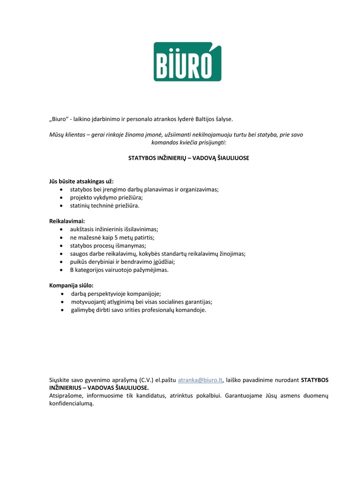 Biuro, UAB Statybos inžinierius – vadovas Šiauliuose