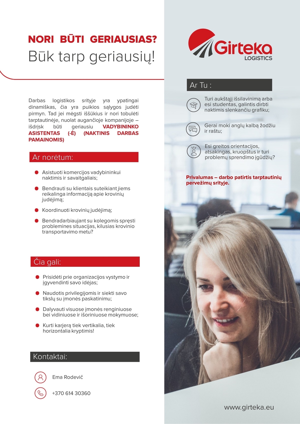 Girteka logistics, UAB VADYBININKO ASISTENTAS (-Ė) (NAKTINIS DARBAS PAMAINOMIS)