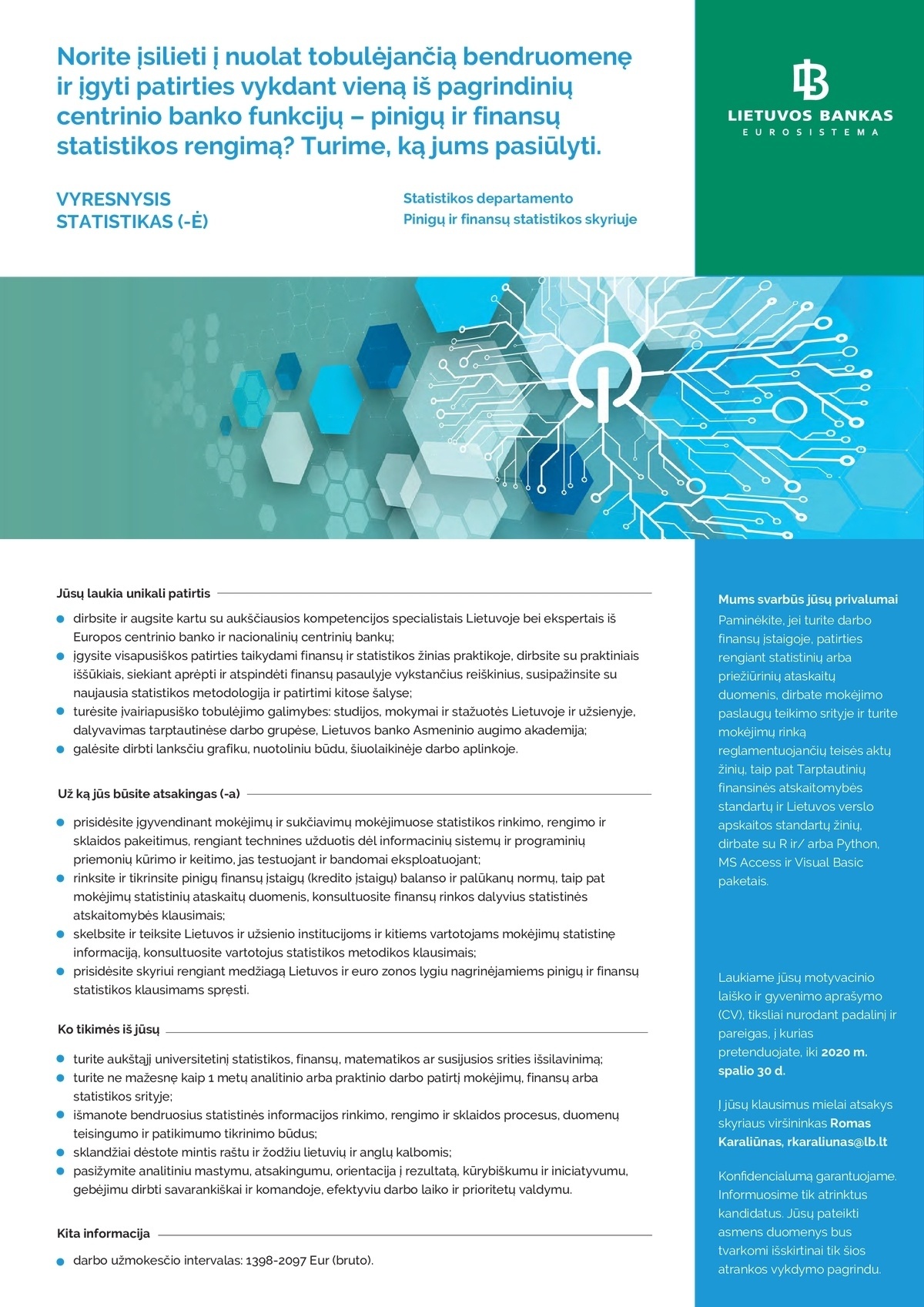 • prisidėsite skyriui rengiant medžiagą Lietuvos ir euro zonos lygiu nagrinėjamiems pinigų ir finansų statistikos klausimams spręsti.