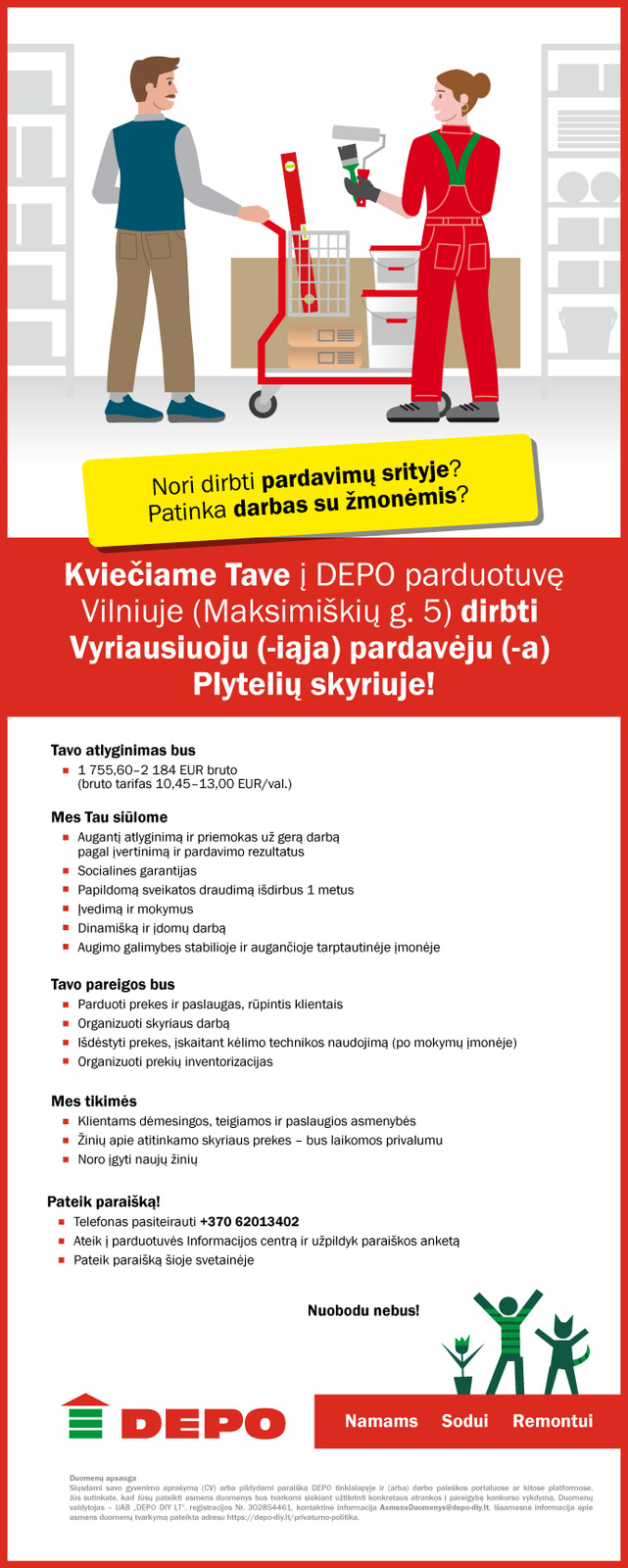 Vyriausiasis (-ioji) pardavėjas (-a) plytelių skyriuje Vilniuje (Maksimiškių g. 5)